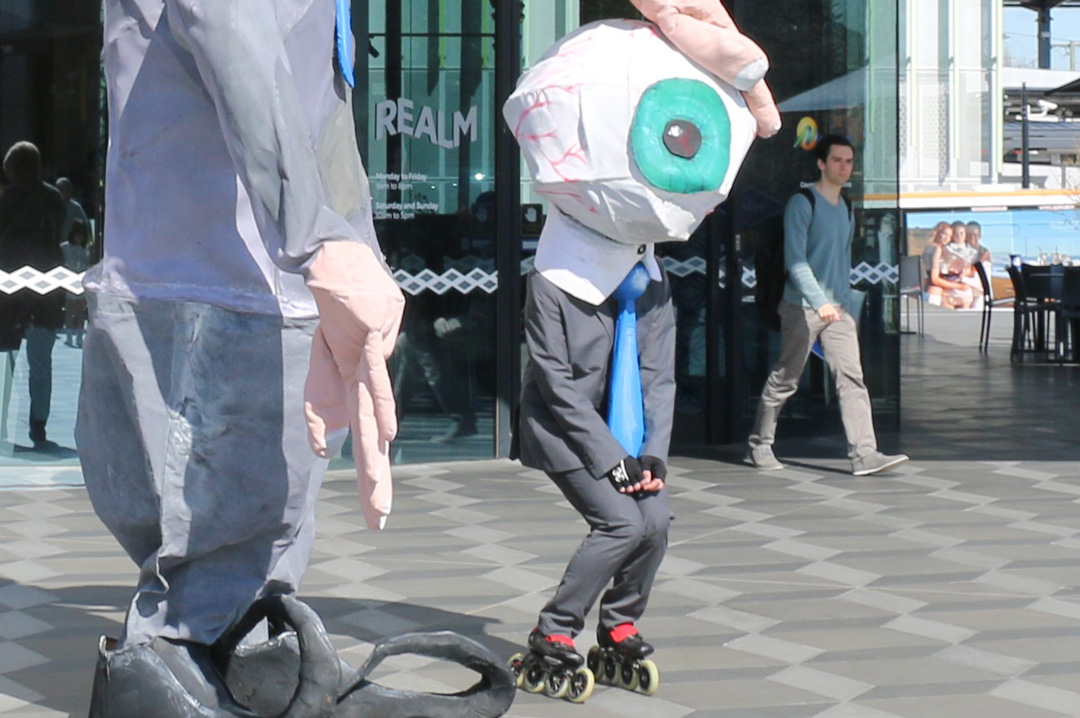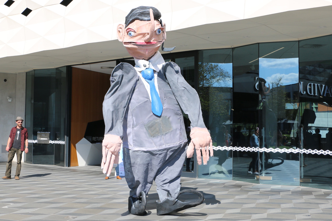 Five Easy Payments is an outdoor giant puppet performance set in the outer suburbs of Melbourne, tackling themes of surveillance and fraud in the modern world. Five Easy Payments was created by VCAL students from Swinburne University, in collaboration with Snuff Puppets as a People Puppet Project, and in partnership with the City of Maroondah.
